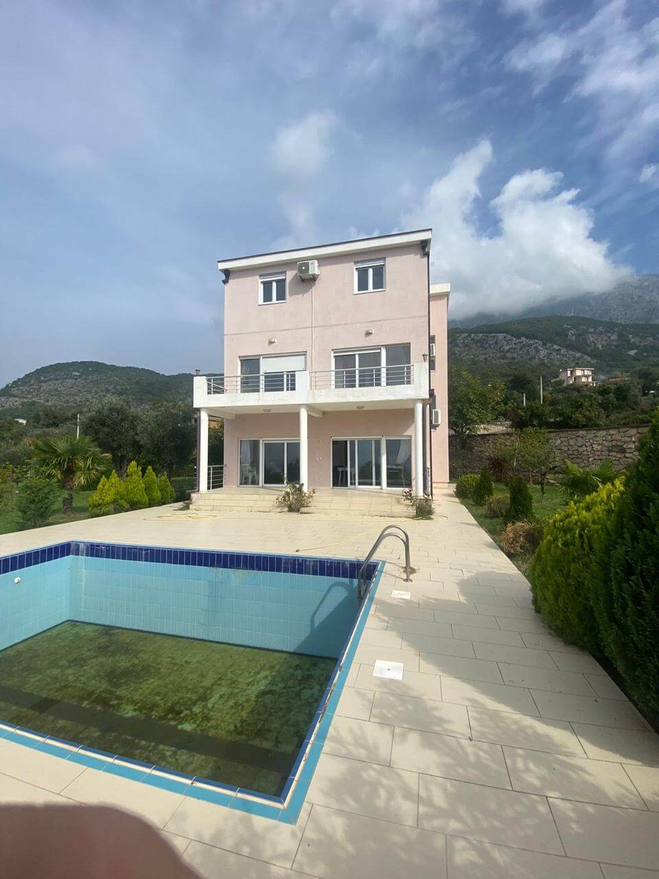 House for sale in Dobra Voda. Year of construction 2010. Size of the plot 2.100 m² Size of the house 250 m² First floor and 2 floors 5 bedrooms per floor, 3 bathrooms, water basin, septic tank, swimming pool, video surveillance, alarm, underfloor heating, fireplace, the house is completely tiled.