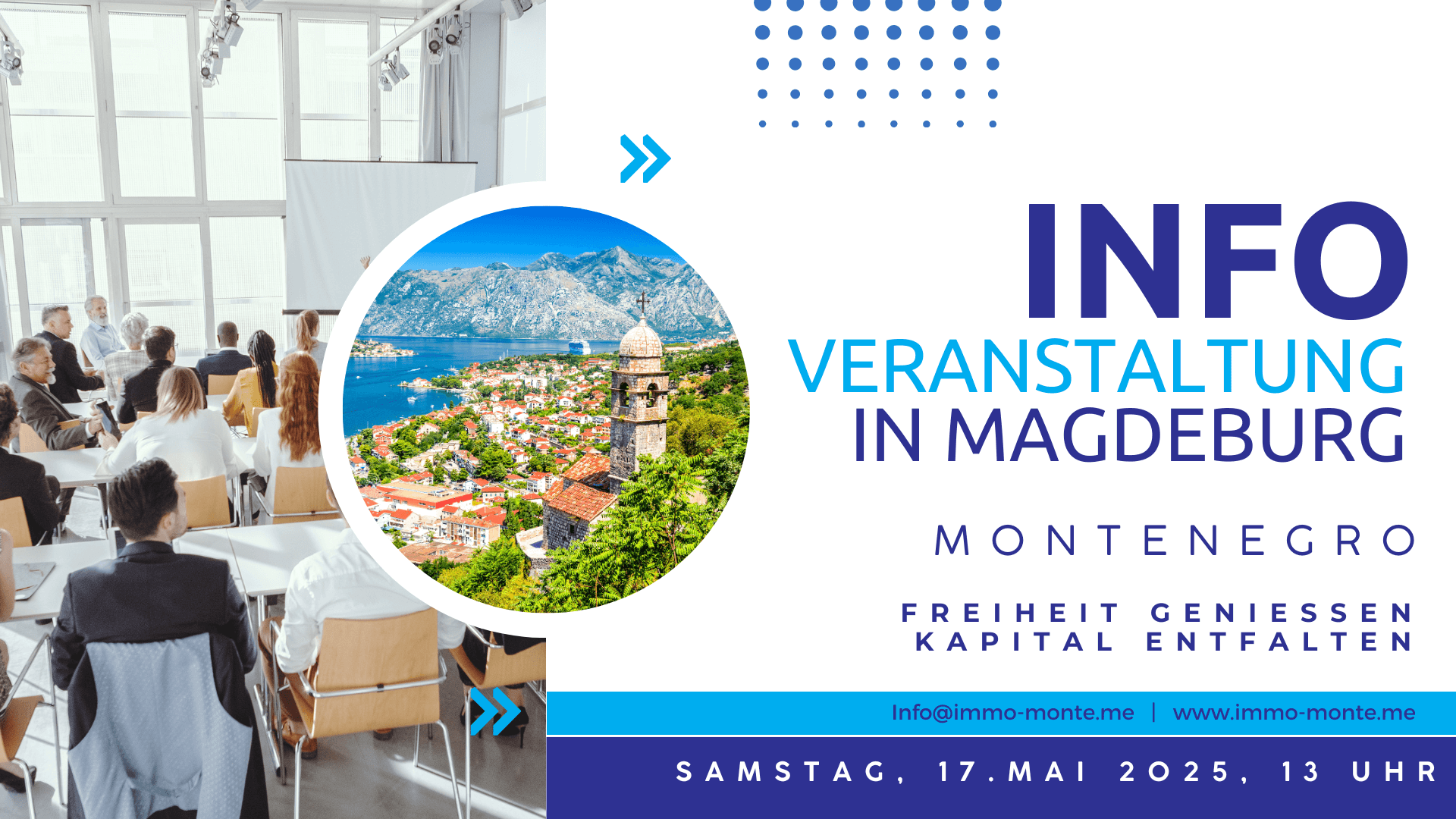 Информационное мероприятие в Магдебурге Черногория Наслаждайтесь свободой - развивайте капиталБольше чем страна - ваша перспектива для роста и качества жизни! Испытайте Черногорию: Откройте для себя возможности,...