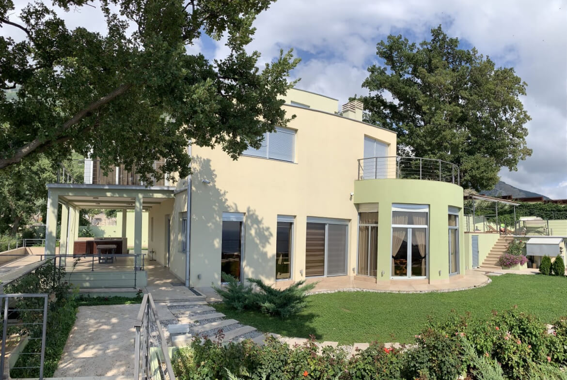 На участке площадью 1500 м², вдали от соседей, на высоте 140 м над уровнем моря, расположена вилла современного дизайна площадью 370 м². Из окон открывается чудесный вид на море и горы. Пляжная зона с бассейном-инфинити с видом на Адриатическое море. Здесь есть огромная крытая терраса с большим обеденным столом из гранита и видом на море и горы. На втором этаже есть круглая терраса с видом на пляжную зону и море.