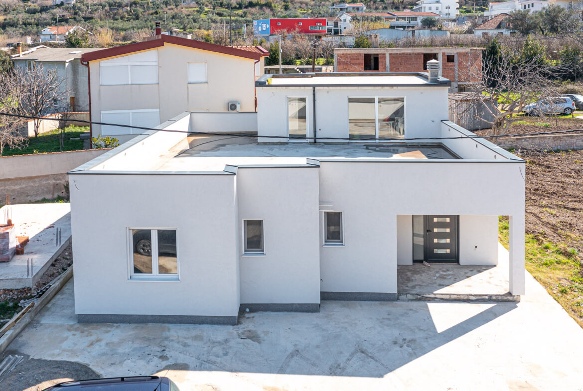 Дом для продажи в Баре – район Залево. Год постройки 2022. Жилая площадь 160 м², участок 832 м². Первый этаж (160 м²) + галерея (40 м²). 3 спальни. Городская вода и канализация, камин. Парковочные места.